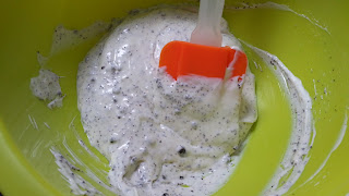 4)把芝士乳酪糊分成 2 份。