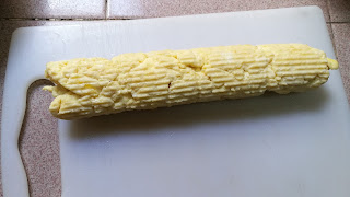 6)取出,放在寿司竹帘上,稍微卷紧,调整形状。