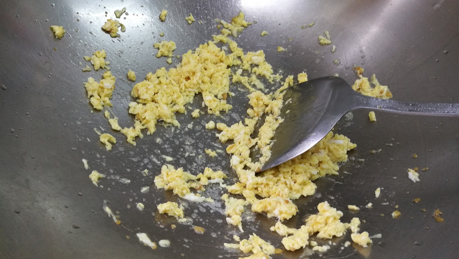 2)慢慢倒入蛋液,快速炒散,炒香。